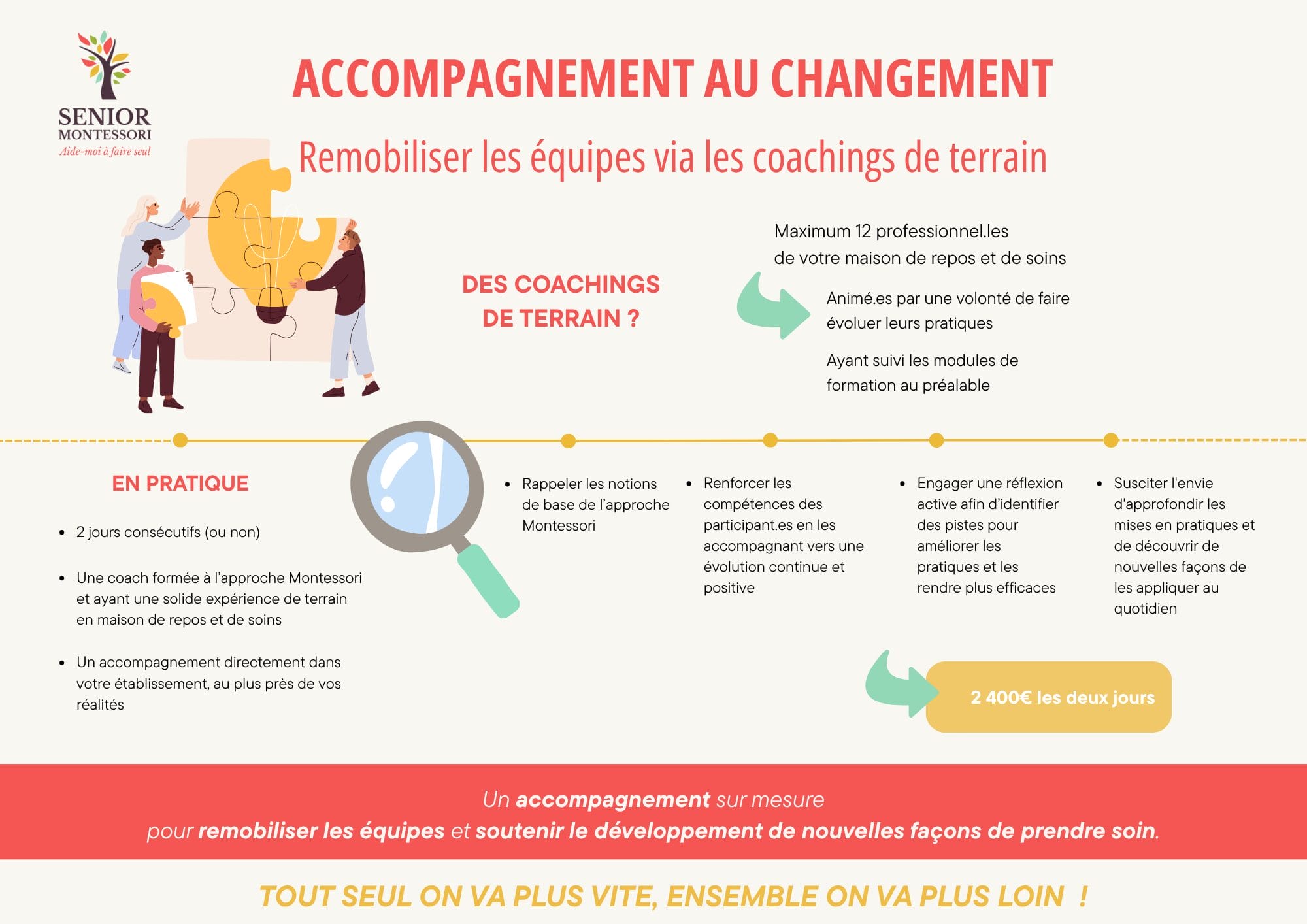 Dans cet objectif, nous proposons un parcours d’accompagnement et de formation qui s’adresse à l’ensemble des corps professionnels opérant en MR/MRS (aide-soignante, ergothérapeute, cuisinier, techniciens de surface, psychologues, assistantes sociales, équipe d’encadrement ou de direction, etc.). Il s’agit d’un accompagnement, étape par étape, qui vise à engager, former, et soutenir les professionnels de la MR/MRS dans la dynamique de changement au travers de formations sur leur lieu de travail, d’animations collectives et participatives, et la mobilisation d’outils et d’exemples concrets et des principes d’animation participative et de facilitation habilitante.